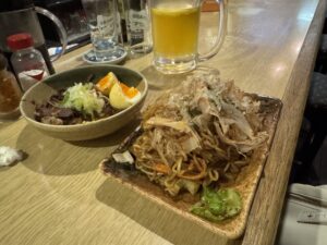 サラダと牛スジ煮込みと焼きそばを注文!